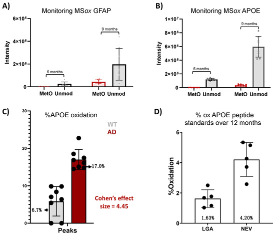To further explore the translational potential of the ox-APOE and ox-GFAP peptides as biomarkers, we need to clarify whether the differential expression of GFAP and APOE MSox peptides is an artifact of the differential total protein expression (Figure 4). To do so, we looked at the area under the curve (AUC) summing APOE peptides LGAD[M]EDLR and NEVT[M]LGSTEEIR and GWFEPIVED[M]HR, GFAP peptides AEM[M]ELNDR, EQLAQQQVHVE[M]DVAKPDLTAALR, and TQYEAVATSN[M]QETEEWYR, and their total unoxidized peptide AUC values. No MSox APOE nor MSox GFAP were detected at 3 months. At 6 months, levels close to the lower limit of detection were registered for both MSox APOE (NEVT[M]LGSTEEIR) and MSox GFAP (AEM[M]ELNDR and EQLAQQQVHVE[M]DVAKPDLTAALR) in one sample (Figure 4A,B). At 9 months, there was an increase in the AUC of both unmodified GFAP and APOE by ~14% and~100%, and MSox GFAP and APOE by ~73% and 51%, respectively (Figure 4A,B). To understand whether these increases in MSox levels reflected changes in stoichiometry, we chose to focus our analysis on the APOE protein at 9 months (Figure 4C,D). Therefore, we compared the average MSox-APOE% between WT (n = 8) and 5XFAD (n = 8) mice for the two APOE peptides above. For WT mice, an average of 6.7% APOE oxidation was seen, while for 5XFAD mice, an average of 17.1% oxidation for the two peptides was seen. These results reflect a 4.45 Cohen’s effect size among the two groups (Figure 4C). These data confirm a significant difference in MSox APOE stoichiometry between WT and 5XFAD; thus, MSox speciation targets APOE in this model. To further explore the ability to monitor MSox APOE peptides as biomarkers, we tested whether targeted MS approaches would be adequate to monitor these peptides. The scientific community’s resistance towards MSox being a biologically relevant PTM hinges in part on the fact that MSox can also potentially occur or be removed spontaneously. However, the data here show very reproducible MSox measurements, even on samples analyzed at separate times. Further, to assess whether parallel reaction monitoring (PRM) would be adequate to monitor MSox APOE changes, we decided to track the spontaneous oxidation levels of unmodified APOE peptide standards (LGADMEDLR and NEVHTMLGQSTEEIR) over a 12-month period.
