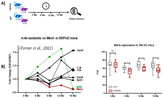 Functional genomics data for 5XFAD mice [39]. (A) Longitudinal RNAseq expression data from hippocampus tissues of 5XFAD mice at 4, 8, 12, and 18 months was extracted from [39]. (B) The plot shows longitudinal variations in MsrA, nuclear factor erythroid 2–related factor 2 (Nrf2) transcription factor, and antioxidant enzymes.