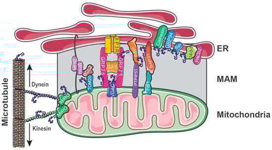 Mitofusin 2 (MFN2) is a mitochondrial fusion protein that, together with MFN1, coordinates the fusion of the OMM of adjacent mitochondria [191]. In addition, MFN2 is a MAM protein that tethers the ER and mitochondria and serves as a suppressor of mitophagy [192,193]. The ubiquitination of MFN2 by Parkin in a PINK1-dependent mechanism regulates MAM integrity by the destruction of ER–mitochondria contact sites, with MFN2 disassembly triggered by p97/VCP [193]. At the MAM, MFN2 is directly regulated by AMPK, a cellular energy sensor. In states of energy deprivation, AMPK is activated and translocates from the cytosol to the MAM, directly interacting with MFN2 to induce autophagy and increase the formation of MAMs [104].