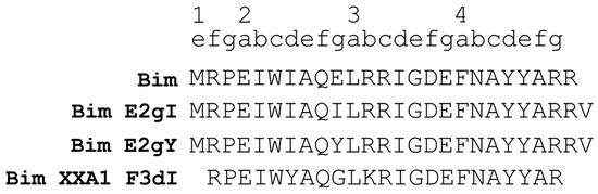 Sequence of the top scoring Bim-based peptides. The heptad convention used to refer to positions in the BH3 peptide is shown. Numbering uses the convention (abcdefg)n. Complete heptad repeats 2 to 4 are indicated above the sequences.