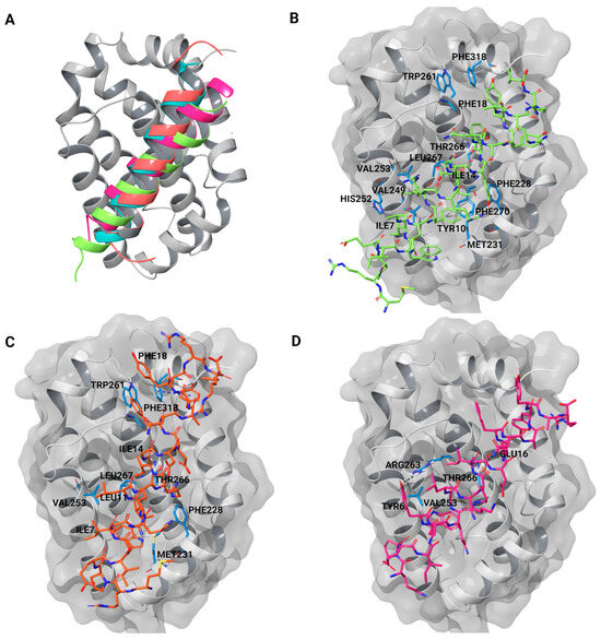 The BH3-binding groove of Mcl-1 carries four pockets (P1–P4) that interact with hydrophobic side chains (H1–H4) of pro-apoptotic proteins [25,26]. These pockets and the Arg263 residue within the Mcl-1 BH3 groove represent hotspots crucial for peptide binding [27]. Recently, Wang et al. (2021) reported the Mcl-1 hotspot residues within the P1–P4 pockets based on the Mcl-1/BIM complex (PDB: 2NL9)—P1: Leu235, Leu246, and Val249; P2: Met231, Met250, Val253, Phe254, Leu267, Phe270, Gly271, Val274, Leu290, and Ile294; P3: His224, Ala227, Phe228, and Thr266; and P4: Val216, Val220, and Val265 [28].