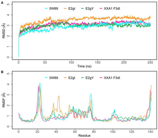 The root mean square deviation (RMSD) of a protein in a simulation provides insight into the overall deviation from the initial structure. Figure 4A shows the progression of protein RMSD in the presence of peptides in 250 ns MD simulations. In all peptide complexes, Mcl-1/E2gI, Mcl-1/E2gY, and Mcl-1/XXA1 F3dI, the system stabilized under 4 Å after a few nanoseconds (Figure 4A). After an initial period of adjustment, the peptides reached a relatively stable conformation during the simulation. To investigate the residue-level protein flexibility for each system, the root mean square fluctuation (RMSF) values of backbone atoms were evaluated. Figure 4B illustrates the fluctuations of each residue in the protein structure. Based on the calculated RMSF values, as depicted in Figure 4B, it was noted that the loop region spanning from Ala190 to Thr205, which connected the α1 and α2 helices, exhibited the largest fluctuations. Furthermore, the flexibilities of the loop regions (Asp236 to Asp242) in all the complexes may be directly related to the structural adjustment of Mcl-1 helix H4 with the three peptides (Figure 4B). The radius of gyration (Rg) shows the structural compactness and stability of the molecules [45]. The Rg values of E2gI/Mcl-1, E2gY/Mcl-1, and XXA1 F3dI/Mcl-1, and the crystallographic structure with the peptide inhibitor (PDB ID: 5W89), were calculated from the generated MD trajectories of 250 ns (Supplementary Figure S1).