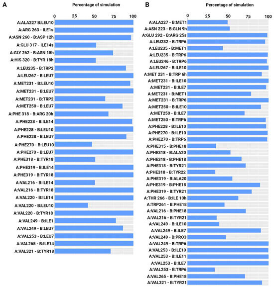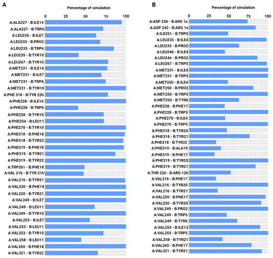 Percentage of simulation time during which intermolecular polar and hydrophobic contacts were retained between Mcl-1 and peptides in the 250 ns systems. (A) Mcl-1/SAH-MS1-18 inhibitor, and (B) Mcl-1/E2gI.