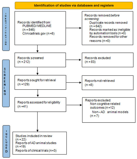 For the purposes of this systematic review, we followed the PRISMA 2020 principles [16]. The PubMed and MEDLINE databases were searched for peer-reviewed research articles investigating and/or discussing the efficacy of fluoxetine treatment for cognitive symptoms of AD, published in the English language with no time restrictions. The search was conducted between September 2022 and April 2024. Both preclinical and clinical studies were included. In order to include most of the key recent evidence, we screened the references of the selected articles for additional relevant articles. We used the terms “Alzheimer’s disease”, “cognitive decline”, “memory loss”, “treatment”, “therapy”, “pharmacological”, and “Fluoxetine” in different combinations. For the narrative synthesis, our initial categorization was based on the efficacy of fluoxetine having been investigated in cognitive function of AD animal and human studies, followed by a discussion of limitations and potential future directions. Figure 1 shows the flow diagram that depicts the process of study selection.
