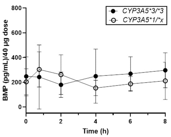 Concentration vs. time profile of plasma BMP for patients with the CYP3A5*3/*3 vs. CYP3A5*1/*x and CYP3A4*1/*1 genotypes. Data represent the mean ± standard deviation of n = 5 and n = 3 participants with the CYP3A5*3/*3 (closed circles) and CYP3A5*1/*x (open circles) genotypes, respectively.