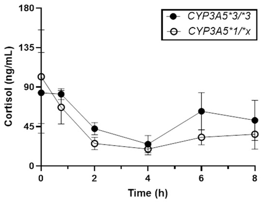 Concentration vs. time profile of plasma cortisol for patients with the CYP3A5*3/*3 vs. CYP3A5*1/*x and CYP3A4*1/*1 genotypes. Data represent the mean ± standard deviation of n = 5 and n = 3 participants with the CYP3A5*3/*3 (closed circles) and CYP3A5*1/*x (open circles) genotypes, respectively.