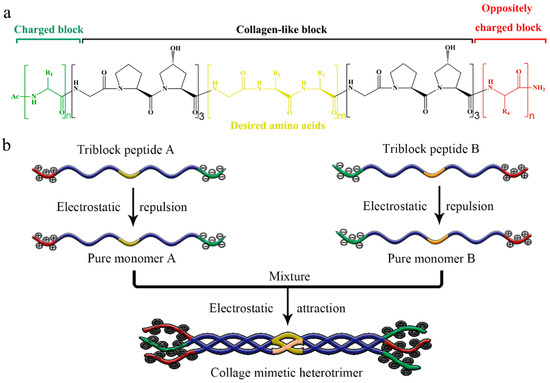- Gauba, V.; Hartgerink, J.D. Self-assembled heterotrimeric collagen triple helices directed through electrostatic interactions. J. Am. Chem. Soc. 2007, 129, 2683–2690. [Google Scholar] [CrossRef] [PubMed]