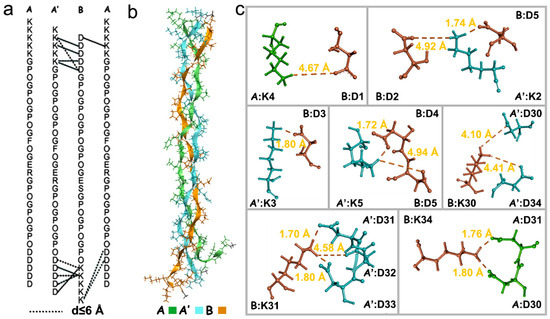 - Hentzen, N.B.; Islami, V.; Kohler, M.; Zenobi, R.; Wennemers, H. A Lateral Salt Bridge for the Specific Assembly of an ABC-Type Collagen Heterotrimer. J. Am. Chem. Soc. 2020, 142, 2208–2212. [Google Scholar] [CrossRef] [PubMed]