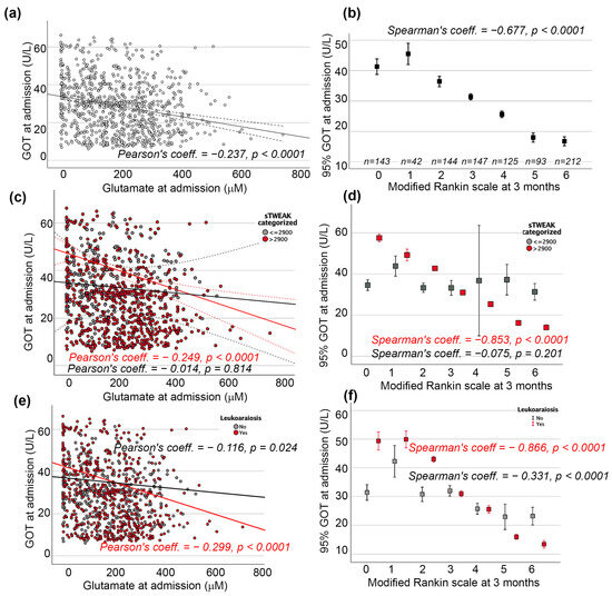 Additionally, the correlation between GOT and glutamate levels at admission was re-analyzed according to the leukoaraiosis degree; the significant negative correlation between them was confirmed in both groups with (Pearson’s correlation coefficient: −0.299; p < 0.0001) and without leukoaraiosis (Pearson’s correlation coefficient: −0.116; p = 0.024) (Figure 1e). Consequently, the significant negative correlation between GOT and mRS was maintained regardless of the presence or absence of leukoaraiosis (Figure 1f). However, the logistic regression model only confirmed this independent association of higher levels of GOT with lower odds of poor functional outcome at 3 months in the presence of this neuroimaging biomarker (OR: 0.75; CI 95%: 0.69–0.82; p < 0.0001; Table 3).