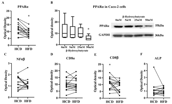 19]. The present data from the Caco-2 cells also indicate that the accumulation of ketone bodies has a direct feedback inhibitory effect on PPARα expression, which could explain a temporal switch from beneficial to detrimental effects of prolonged dietary high fat exposure. In addition, as PPARα coordinates inflammatory signaling pathways, which may be accompanied by epithelial barrier dysfunction, we studied the expression of NFκβ and T Lymphocytes CD8α and CD8β [