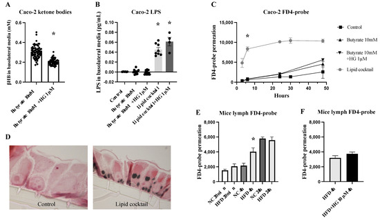 Experimental procedures Caco-2: Differentiated monolayers of Caco-2 cells were cultured for 48 h in low-concentration glucose (5.5 mM) media (SF and ITS) with different combinations of additives: short-chain fatty acid butyrate 10 mM (Sigma-Aldrich), HMGCS2 inhibitor hymeglusin 1μM (Santa Cruz Biotechnology, Dallas, TX, USA), β-Hydroxybutyrate 5–50 mM (Sigma-Aldrich), FD4 probe 2 mg/mL, and LPS 1 µg/mL (Sigma-Aldrich). In some experiments, the Caco-2 cells were stimulated with a cocktail of fats: cholesterol 0.05 mM, 2-monooleoylglycerol 0.2 mM, L-∝-lysophosphatidyl choline 0.2 mM, and oleic acid 0.6 mM, as previously described [