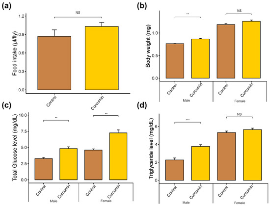 Body weight, triglyceride, and glucose levels were determined on 5-day-old mature flies reared on either curcumin or a control diet to obtain insights into the physiological changes when flies are fed with curcumin. For both sexes, the body weight slightly increased in the curcumin diet (Cohen’s d < 0.2). However, this increase was only statistically significant in male flies (p = 0.01), with a mean difference of 0.10 mg compared to the control (Figure 1b). Moreover, we measured triglyceride and total glucose levels to assess the implications of increased body weight. Triglyceride content was not statistically significant in female flies (p > 0.05), but a high glucose increment of 2.36 mg/dL was observed when fed with the curcumin-supplemented diet (p < 0.01, Cohen’s d > 0.7) (Figure 1c,d). In addition, male flies exhibited an increase of 1.5 mg/dL for glucose and triglycerides compared to the control group (Figure 1c,d).