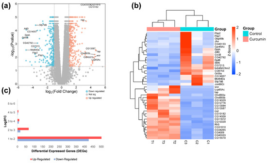 To obtain a comprehensive overview of the impact of curcumin on gene expression in D. melanogaster, we analyzed RNA-seq data obtained from flies reared on control and curcumin diets. The cDNA libraries were sequenced using an Illumina NextSeq500 platform, producing 184,079,746 raw reads. After quality control filtering (Q > 30), 14.44% of the reads were removed, leaving 157,504,046 clean reads (Table S1). The reads were subsequently mapped to the D. melanogaster reference genome, with 96.6 to 97.5% of the reads being successfully mapped. A principal component analysis (PCA) revealed that the gene expression under control and curcumin diets were clustered according to the biological replicate and separated in the PC1 × PC2 score plot according to the diet differentiation by PC1 (62%) and PC2 (21%) (Figure S2). In our differentially expressed genes (DEG) analysis, we identified 1043 differentially expressed genes (DEGs) with a fold change of ≥1, comparing the curcumin to the control diet (Table S2). Of these, 589 were upregulated, and 453 were down-regulated. The top up-and down-regulated genes, logFC distribution, and a heatmap of the top 40 (20 up- and 20 down-regulated genes) are shown in Figure 2a–c.
