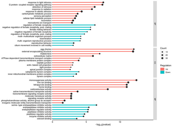 The identified DEGs were annotated using the BLASTx algorithm with the FlyBase database. Gene ontology (GO) enrichment was performed for biological processes, cellular components, and molecular functions using TopGO, resulting in 185 terms (Table S3). The top GO terms in the DEGs (Figure 3) were “response to abiotic stimulus,” “locomotion cellular,” “lipid metabolic process,” “monoatomic ion transport,” and “G protein-coupled receptor signaling pathway” for biological processes. For cellular components, the top GO terms were “external encapsulating structure,” “extracellular matrix,” “plasma membrane protein complex,” “egg chorion,” and “inner mitochondrial membrane protein complex”. The most abundant GO terms for molecular function were “signaling receptor activity”, “molecular transducer activity”, “iron ion binding”, “transmembrane signaling receptor activity”, and “monooxygenase activity”.