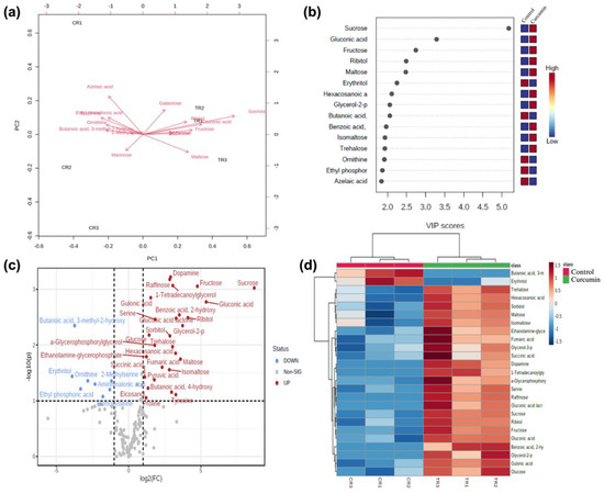 Untargeted metabolomics of D. melanogaster reared on curcumin diet. (a) Principal component analysis (PCA) biplot between the top 15 selected metabolites in the control and treatment diet. (b) Important compounds identified by PLS-DA in Drosophila. The colored boxes on the right indicate the relative concentration of the corresponding metabolite. (c) Volcano plot visualization of the important metabolites selected by both fold change and p-value. The red circles represent the upregulated metabolites, while the blue circles represent the down-regulated metabolites. (d) The top 25 most important metabolites by area response of D. melanogaster in the two different diet treatments: control (CR) and curcumin (TR).