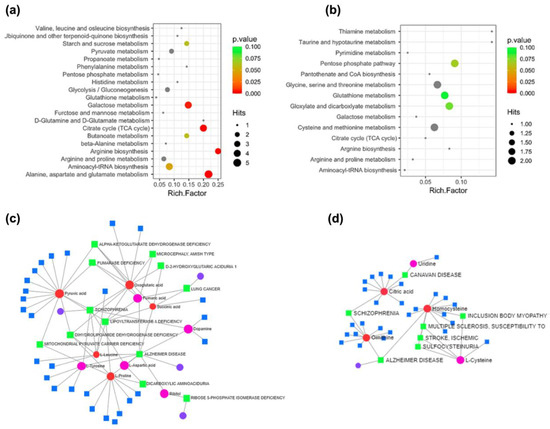 Additionally, we constructed a metabolite–disease interaction network using up- and down-DAMs (Figure 6c,d). From the up-DAMs, we identified associations between pyruvic acid, L-leucine, and oxoglutaric acid with diseases such as schizophrenia, lipoyltransferase 1 deficiency, and dihydrolipoamide dehydrogenase deficiency. Succinic and fumaric acids were linked to lung cancer and lipoyltransferase 1 deficiency. L-proline correlated with dicarboxylic aminoaciduria, while ribitol was associated with ribose 5-phosphate isomerase deficiency. Oxogluratic acid was found to be linked to diseases such as fumarase deficiency, alpha-ketoglutarate dehydrogenase deficiency, microcephaly—Amish type, and d-2-hydroxyglutaric aciduria 1. We also found L-proline, L-leucine, succinic acid, dopamine, L-aspartic acid, and L-tyrosine associated with Alzheimer’s disease. Moreover, within the network of down-DAMs, citric acid was identified, showcasing connections to Canavan disease and schizophrenia. Ornithine was implicated in schizophrenia and Alzheimer’s disease, while homocysteine exerted influences on Alzheimer’s disease, encompassing body myopathy, multiple sclerosis, stroke, and sulfocysteinuria.