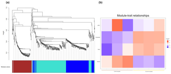 WGCNA analysis results. (a) A hierarchical cluster dendogram showing co-expression modules identified and (b) heat map analysis of the different modules in control and curcumin diets.