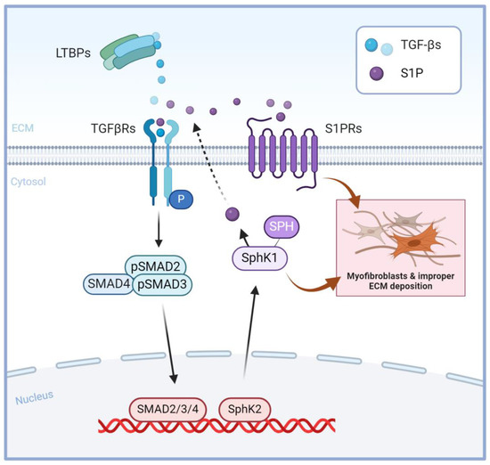S1P and TGF-β signaling cross-talk: TGF-β receptor activation induces SMAD signaling cascades, resulting in the regulation of gene expression, including SphK regulation. Stimulation of SphK1 leads to the formation of S1P, which activates S1P receptors, inducing fibrotic cell responses. Created with Biorender.com.