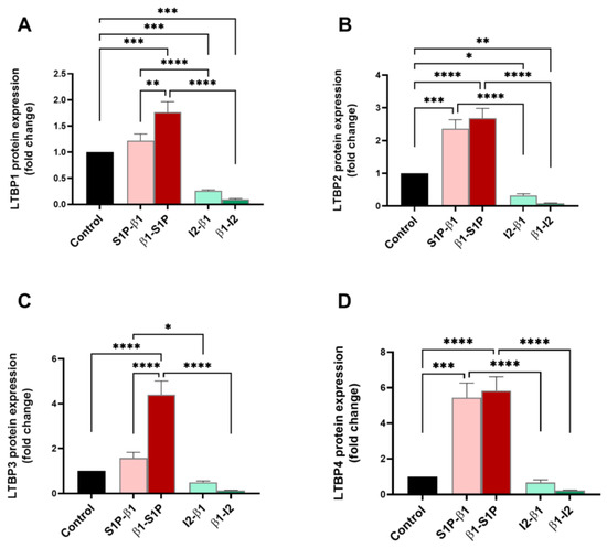 Latent TGF-β binding proteins-1 through -4 (LTBPs 1–4) are known activators of TGF-β and were investigated here for their protein expressions following treatment with all groups tested. LTBP1 expression was significantly upregulated by β1-S1P stimulation compared to the controls (p = 0.0005), S1P-β1 (p = 0.0048), and β1-I2 (p < 0.0001) treatments. In Figure 2A, I2-β1 stimulation led to a significant downregulation of LTBP1 compared to S1P-β1 treatment (p < 0.0001) and the controls (p = 0.006). LTBP2 expression was significantly upregulated by β1-S1P stimulation compared to the controls (p < 0.0001) and β1-I2 treatment (p < 0.0001) (Figure 2B). Figure 2B showed that treatment with I2-β1 caused a significant downregulation of LTBP2 compared to S1P-β1 treatment (p < 0.0001) and the controls (p = 0.0258). The expression of LTBP3 was significantly upregulated by β1-S1P stimulation compared to the controls (p < 0.0001), S1P-β1 (p < 0.0001), and β1-I2 (p < 0.0001) treatments (Figure 2C). The I2-β1 stimulation caused a significant downregulation of LTBP3 compared to S1P-β1 treatment (p = 0.0298) (Figure 2C). LTBP4 was significantly upregulated by β1-S1P stimulation compared to the controls (p < 0.0001) and β1-I2 treatment (p < 0.0001) (Figure 2D). Treatment with I2-β1 led to a significant downregulation of LTBP4 compared to S1P-β1 (p < 0.0001) treatment and the controls (Figure 2D).