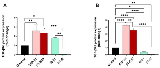 TGF-β receptors I and II (TGF-βRI and TGF-βRII), which are activated via binding with active TGF-β, were investigated for their protein expressions for all groups tested. TGF-βRI expression was significantly upregulated by stimulation with β1-S1P compared to the controls (p = 0.0106), β1-I2 (p = 0.0004), and S1P-β1 compared to the controls only (p = 0.0041) (Figure 3A). β1-I2 treatment caused a significant downregulation of TGF-βRI compared to I2-β1 (p = 0.0023; Figure 3A). TGF-βRII was significantly upregulated by the S1P-β1 treatment compared to the controls (p < 0.0001), β1-S1P (p = 0.0076), and I2-β1 (p < 0.0001) treatments (Figure 3B). β1-S1P stimulation significantly upregulated TGF-βRII compared to the controls (p < 0.0001) and β1-I2 treatment (p < 0.0001) (Figure 3B).