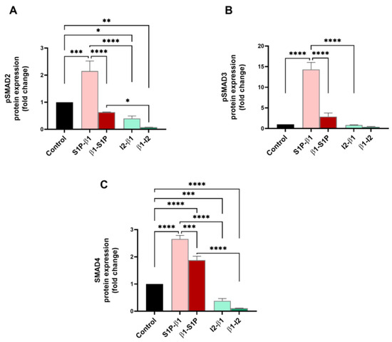 SMADs 2–4, which are the main signal transducers for TGF-β receptors, were investigated for their protein expressions for all groups tested. Figure 4A shows that pSMAD2 expression was significantly upregulated by S1P-β1 stimulation compared to the controls (p = 0.0008), β1-S1P (p < 0.0001), and I2-β1 (p < 0.0001) treatments. Stimulation with β1-I2 led to a significant downregulation of pSMAD2 compared to the controls (p = 0.0035) and β1-S1P treatment (p = 0.0446) (Figure 4A). pSMAD3 expression was significantly upregulated by S1P-β1 compared to the controls (p < 0.0001), β1-S1P (p < 0.0001), and I2-β1 (p < 0.0001) treatments (Figure 4B). SMAD4 expression was significantly upregulated by S1P-β1 treatment compared to the controls (p < 0.0001), β1-S1P (p = 0.0002), and I2-β1 (p < 0.0001) treatments (Figure 4C). Stimulation with β1-S1P significantly upregulated SMAD4 compared to the controls (p < 0.0001) and β1-I2 treatment (p < 0.0001) (Figure 4C).