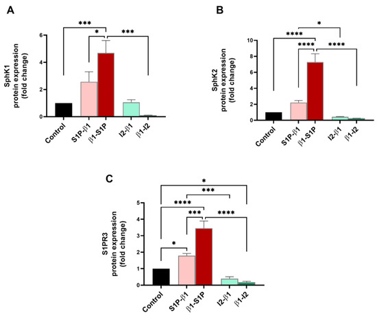 Sphingolipid members (SphK1, SphK2, and S1PR3), which are known to transactivate the TGF-β pathway, were examined for their protein expressions for all groups tested. SphK1 expression was significantly upregulated by β1-S1P treatment compared to the controls (p = 0.0006), S1P-β1 (p = 0.0181), and β1-I2 stimulation (p = 0.001) (Figure 5A). Tge expression of SphK2 was significantly upregulated by β1-S1P compared to the controls (p < 0.0001), S1P-β1 (p < 0.0001), and β1-I2 (p < 0.0001) treatments (Figure 5B). The I2-β1 treatment led to a significant downregulation of SphK2 compared to S1P-β1 stimulation (p = 0.0259; Figure 5B). S1PR3 was significantly upregulated by the β1-S1P treatment compared to the controls (p < 0.0001), S1P-β1 (p = 0.0002), and β1-I2 (p < 0.0001) treatments (Figure 5C). Stimulation with I2-β1 caused a significant downregulation of S1PR3 compared to the S1P-β1 treatment (p = 0.0009; Figure 5C).