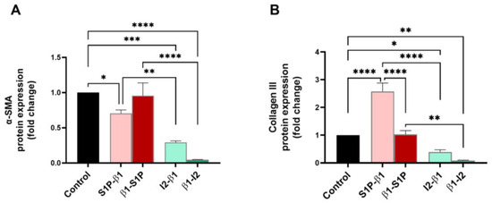 Fibrosis marker protein expressions in HCF 3D constructs in response to stimulation with S1P-β1 (S1P prevention), β1-S1P (S1P rescue), I2-β1 (I2 prevention), and β1-I2 (I2 rescue). (A) α-SMA expression in HCFs (n = 3). (B) Collagen III expression in HCFs (n = 3). One-way ANOVA; * p < 0.05, ** p < 0.01, *** p < 0.001, and **** p < 0.0001.