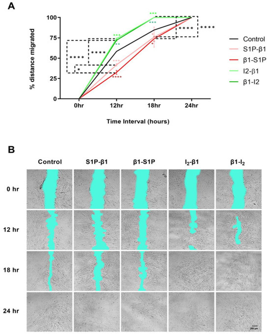 Cellular migration of HCFs was examined in response to stimulation with all groups tested over a period of 24 h. Following 12 h of stimulation with the I2-β1 group, we observed significantly increased wound closure compared with the controls (p = 0.0006) and S1P-β1 (p < 0.0001; Figure 7A). Similarly, the β1-I2 group caused significantly increased wound closure after 12 h compared to the controls (p = 0.0024) and β1-S1P (p < 0.0001) stimulation (Figure 7A). After 18 h, we observed significantly increased wound closure with I2-β1 compared to the controls (p = 0.0008) and β1-S1P (p < 0.0001) and in β1–I2 compared to the controls (p = 0.0008) and β1-S1P (p < 0.0001) stimulation (Figure 7A). After 24 h, all treatment groups reached 100% wound closure (Figure 7A). Representative cell migration images with all groups tested over the course of 24 h are shown in Figure 7B.