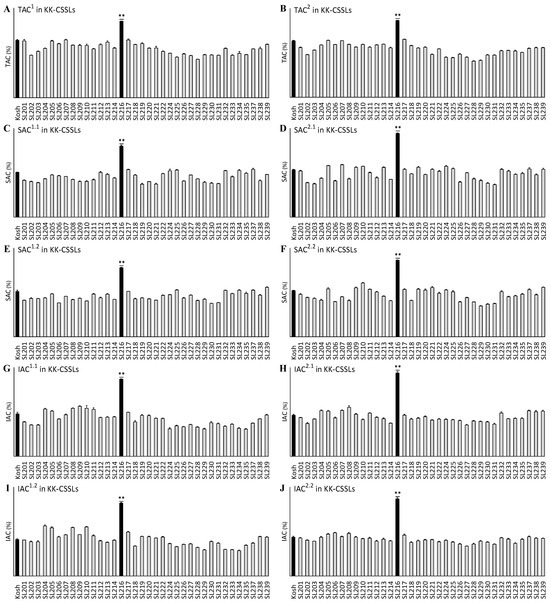 Variation in the total amylose content (TAC), hot water-soluble amylose content (SAC), and hot water-insoluble amylose content (IAC) in the KK-CSSLs including Kosh (Koshihikari, background parent). (A,C,E,G,I) The KK-CSSLs plants were grown in 2016 and the mean values of TAC, SAC, and IAC exhibited abundant variation, ranging from 11.6% to 16.75%, 8.17% to 12.3%, and 3.43% to 3.68%, respectively. (B,D,F,H,J) The KK-CSSLs plants were grown in 2017 and the mean values of TAC, SAC, and IAC exhibited abundant variation, ranging from 10.61% to 16.98%, 7.65% to 13.35%, and 4.06% to 5.84%, respectively. The superscript numbers for TAC, SAC, and IAC indicate 2016 or 2017 (“1” or “2” before the decimal point, respectively) and the first or second measurements (“1” or “2” after the decimal point, respectively). For instance, SAC1.2 represents the second-measured SAC in 2016. Black bars represent the background parent (Kosh) or line with significantly higher TAC, SAC, or IAC than Kosh using an analysis of variance and the least significance difference test (**, p < 0.01). KK-CSSLs, chromosome segment substitution lines with Koshi as the background parent and Kasalath as the donor parent.