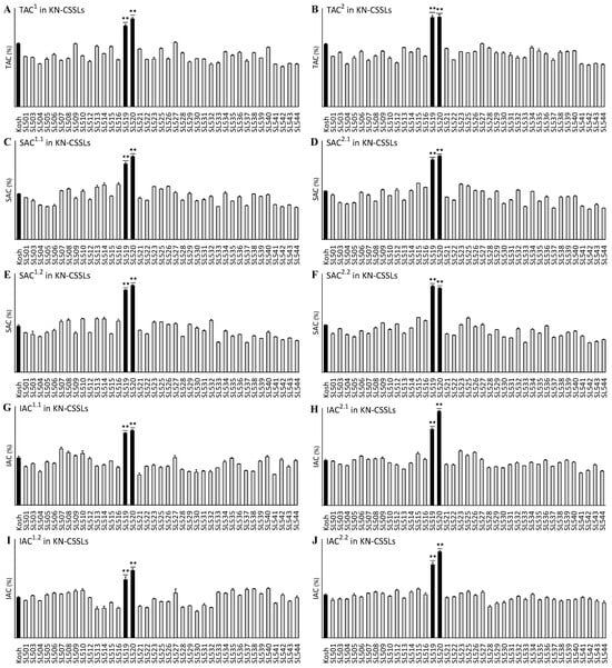 Variation in total amylose content (TAC), hot water-soluble amylose content (SAC), and hot water-insoluble amylose content (IAC) in the KN-CSSLs including Kosh (Koshihikari, background parent). (A,C,E,G,I) The KN-CSSLs plants were grown in 2016 and the mean values of TAC, SAC, and IAC exhibited abundant variation, ranging from 10.58% to 16.98%, 7.22% to 13.42%, and 3.68% to 6.84%, respectively. (B,D,F,H,J) The KN-CSSLs plants were grown in 2017 and the mean values of TAC, SAC, and IAC exhibited abundant variation, ranging from 10.99% to 16.65%, 7.17% to 13.7%, and 3.8% to 6.71%, respectively. The superscript numbers for TAC, SAC, and IAC are described in the Figure 1 legend. Black bars represent the background parent (Kosh) or lines with significantly higher TAC, SAC, and IAC than Kosh using an analysis of variance and the least significance difference test (**, p < 0.01). KN-CSSLs, chromosome segment substitution lines with Kosh as the background parent and NonaBokra as the donor parent.