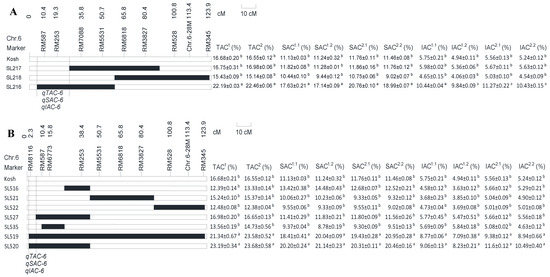 Substitution mapping of the quantitative trait loci (QTLs) qTAC-6, qSAC-6, and qIAC-6 on chromosome 6. (A) The qTAC–6, qSAC–6, and qIAC–6 were mapped to the interval of the distal end–RM7088 on chromosome 6 in the KK–CSSLs. (B) The qTAC–6, qSAC–6, and qIAC–6 were mapped to the interval of the distal end–RM587 on chromosome 6 in the KN–CSSLs. The solid bars represent chromosome segments from the donor parent; the open bars represent chromosome segments from the background parent (Kosh). Different lowercase letters indicate that the mean values significantly differ (p < 0.01), while the same letter indicates no significant difference at p > 0.1 using an analysis of variance and the least significance difference test. The superscript numbers for TAC, SAC, and IAC are described in the Figure 1 legend.