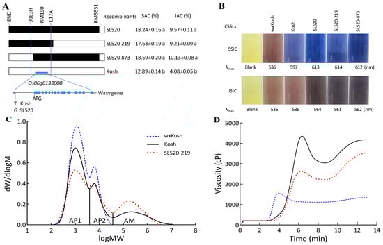 To uncover the mechanism underlying the pleiotropy associated with SAC and IAC, we analyzed the compositions of the HWS and HWI fractions of extracted starch. Amylose–iodine complexes appear blue, while AP–iodine complexes appear brown; thus, we examined the colors of the soluble starch–iodine complex (SSIC) and insoluble starch–iodine complex (ISIC) in wxKosh, Kosh, SL520, SL520–219, and SL520–873 (Figure 4B).