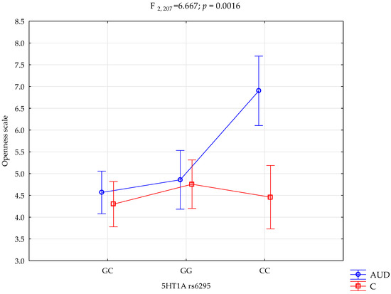 The performed factorial ANOVA of the AUD and control subjects, NEO-FFI, STAI, and 5HTR1A rs6295, showed several interactions influencing the NEO-FFI openness to experience scale variance. We observed a significant effect of alcohol dependency or lack of it (F1,207 = 12.58; p = 0.0005; η2 = 0.057). The power observed for this factor was 94%, and approximately 6% was explained by alcohol dependency or lack thereof on the openness to experience trait variance. Additionally, we observed a statistically significant effect of the 5HTR1A rs6295 genotype and alcohol dependency or lack thereof (F2,207 = 7.21; p = 0.0009; η2 = 0.065) on the openness to experience scale variance. The power observed for this factor was 93%, and approximately 6.5% was explained by the polymorphism of the 5HTR1A rs6295 and AUD, or lack thereof, on the trait’s score variance. Moreover, there was a statistically significant effect of 5HT1A rs6295 genotype interaction and alcohol dependency or lack of it on the openness scale (F2,207 = 6.67; p = 0.0016; η2 = 0.061; Table 4, Figure 1). The power observed for this factor was 91%, and approximately 6% was explained by the polymorphism of the 5HTR1A rs6295 and alcohol dependency or lack thereof on openness trait score variance. The results of the factorial ANOVA of the State-Trait Anxiety Inventory, NEO Five-Factor Personality Inventory traits, 5HTR1A rs6295, AUD, and controls are presented in Table 4.