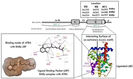Domain structure of RARs. AF-1 = activation function 1; AF-2 = activation function 2; H3, H5, H11 = helices; LBP = ligand binding pocket; ATRA = all-trans retinoic acid; and LBD = ligand binding domain.