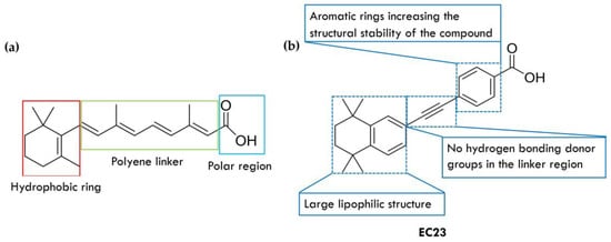 Synthetic pan-RAR agonists mimic the shape and conformation of ATRA (Figure 2b). They have a linear structure and lack hydrogen bonding donor groups in the linker area. Removing the polyene structure found in natural retinoids and replacing it with aromatic rings is the most common approach to designing a pan-RAR agonist. This replacement increases the stability of the molecular structure, creating so-called arotinoids [36]. Replacing the flexible polyenes with more rigid structures allows the synthetic compound to mimic the most effective ATRA conformations [34].