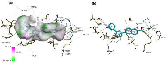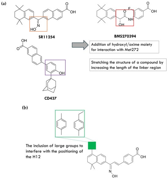 Selective agonism of RARγ can be achieved by designing compounds that bind to the amino acid residues specific to this receptor, i.e., Ala234, Met272, and Ala397 in the LBP of RARγ. The amino acid Met272 is positioned roughly in the middle of the LBP, with the side chain situated above the linker region of a bound retinoid, and formation of a hydrogen bond with the Met272 side chain has been identified as a key strategy for increasing selectivity for RARγ. A hydroxyl or oxime moiety forms a sufficiently strong hydrogen bond with this amino acid moiety, and the compound’s structure must be stretched to form (Figure 3a). This stretching is obtained by increasing the length of the linker, e.g., by introducing a ketone. It will further reduce the compound’s affinity for RARα and increase the selectivity towards RARγ [38].