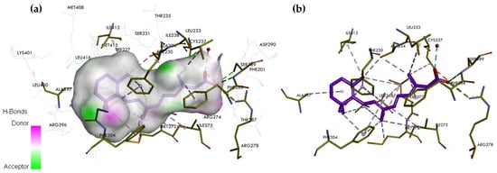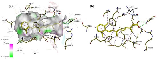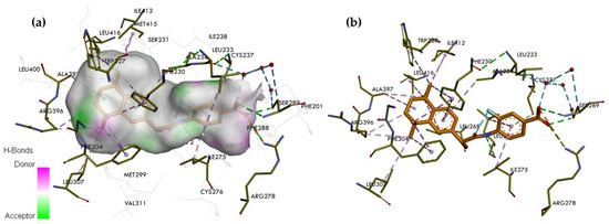 The visualization shows that the non-polar region of ATRA forms favorable van der Waals interactions with the amino acid residues of the hydrophobic LBP of the RARγ, i.e., Leu268 on H5, Phe304 and Leu307 on H7, Arg396 and Leu400 on H11, and Ile412 and Met415 on H12 helix. The center of the pocket is narrower and predominantly hydrophobic. These pocket features allow it to interact well with the lipophilic polyene linker of ATRA. This region interacts with Ile275, Leu271, and Met272 on H5. The electrostatic attraction anchored the carboxylate to a small cluster of polar residues, Leu233, Arg278, and Ser289, at the base of the pocket. In the holo-conformation, H12 adopts a conformation that covers the entrance hole to the receptor pocket. The helix interacts with the hydrophobic regions of the retinoid. This interaction provides a stable platform for CoA attachment. The shape of ATRA has been slightly bent to fit into the LBP of RARγ [33,40].