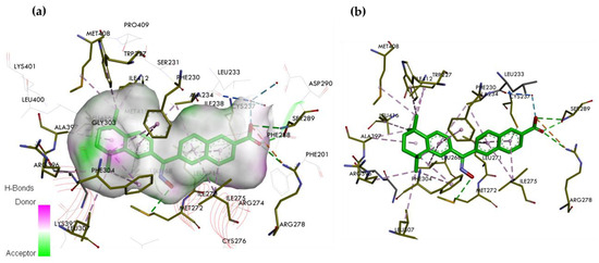 The crystallographic structure of the LBD of RARγ complexed with SR11254 has also been solved (RCSB PDB ID: 1FD0—https://www.rcsb.org/structure/1FD0 (accessed on 21 May 2024)) [44] (Figure 8). SR11254 contains in its structure an oxime group attached to a bridge connecting the 5,6,7,8-tetrahydro-5,5,8,8-tetramethyl-2-naphthalenyl group and the 2-naphthalenic acid group. The replacement of the ketone by oxime results in the hydroxyl moving closer to Met272. The presence of this group favors the formation of favorable interactions with the Met272 side chain methyl. The oxime-derived hydroxyl confers isotype selectivity for RARγ by hydrogen bonding with the Met272 sulfur. SR11254 binds the receptor in two orientations of the oxime group, corresponding to the Z- and E-tautomers [38]. The carboxyl of SR11254 is anchored to the receptor by a network of hydrogen bonds formed with Arg278 and Ser289, a water molecule, and the carbonyl backbone of the Leu233 residue. Hydrogen bonds are between the hydroxyl of the Z- and E-tautomers and the sulfur of Met272. However, the bonds formed between the oxygen of the hydroxyl of the Z- and E-isomers and the methyls of Met272 and Ile275 are atypical. Bonding is stronger than van der Waals forces. This bonding indicates that hydrogen bonds exist between the oxygen of the hydroxyl and the hydrogens attached to the aliphatic carbons. These data suggest that the hydroxyl of both isomers of SR11254 acts simultaneously as a hydrogen bond donor and acceptor, resulting in a synergy between O-H---S and C-H---O hydrogen bonds [44]. Consideration of C-H---O hydrogen bonding in drug design is critical, especially when specific interactions are difficult to introduce in the hydrophobic environment of RARγ LBP [44].