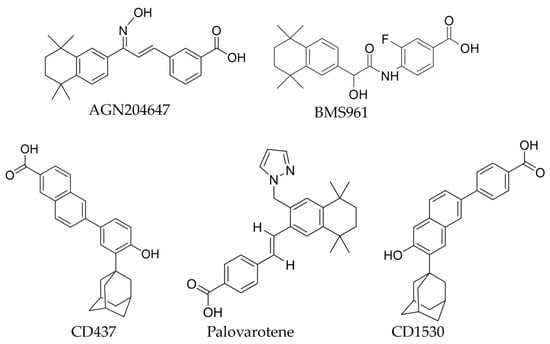 Over the last few years, the molecular basis of the interaction between synthetic analogs of retinoic acid and RARγ has been studied. The fundamental molecular interactions that are responsible for the isotype selectivity and biological activity of synthetic analogs have been investigated using molecular modeling techniques. The results have been compared with data obtained for natural RAR ligands [33]. These studies determined X-ray crystallographic structures of the LBDs of RARγ in complex with selective agonists. These provided further insight into the structure and properties of the complex that synthetic analogs form upon binding to RARγ. Analogs were positioned in the LBP, and their effects on its structure and activity were characterized. Knowledge of the molecular interactions of known ligands with RARγ is essential for the rational design of new molecules. The structure of selected complexes formed after docking agonists to RARγ have been described.