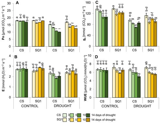 Gas exchange parameters: (A) net photosynthetic rate (Pn), (B) transpiration (E), (C) stomatal conductance (gs), and (D) water use efficiency (WUE) in Chinese Spring (CS) and SQ1 wheat cultivars depending on the treatment: control and drought. Mean values followed by the same letter are not significantly different (p ≤ 0.05). Error bars indicate SE (n = 7).