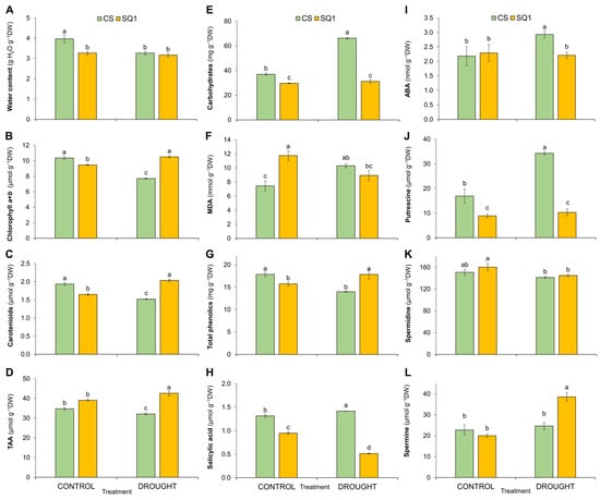 (A) Water content [g H2O g−1 DW]; content of photosynthetic pigments: (B) chlorophyll a+b [µmol g−1 DW] and (C) carotenoids [µmol g−1 DW]; (D) total antioxidant activity (TAA) [µmoles Trolox g−1 DW]; (E) soluble carbohydrates [mg g−1 DW]; (F) lipid peroxidation expressed as malondialdehyde (MDA) concentration [mmol g−1 DW]; (G) total phenolics [mg g−1 DW]; (H) salicylic acid [µmol g−1 DW]; (I) abscisic acid (ABA) [nmol g−1 DW]; and polyamines: (J) putrescine, (K) spermidine, and (L) spermine content [µmol g−1 DW] in Chinese Spring (CS) and SQ1 wheat cultivars depending on the treatment. Treatments were control and drought, measured on the 14th day of drought. Different letters indicate differences between genotypes according to the Duncan test (p ≤ 0.05). Mean values ± SE, n = 3. DW—the dry weight of leaves.