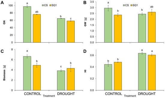 Grain number per plant (A), grain weight per plant (B), biomass (C), and harvest index (HI; (D)) in Chinese Spring (CS) and SQ1 wheat cultivars depending on the treatment: control and drought. Different letters indicate differences between cultivars according to the Duncan test (p ≤ 0.05). Mean values ± SE, n = 3.