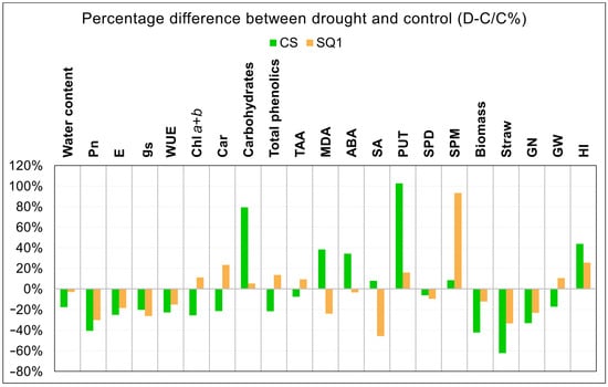 Percentage differences between 14-day drought stress (D) and control (C) for all parameters measured in CS and SQ1 plants.