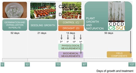Seeds of CS and SQ1 were germinated and vernalized for 7 weeks at 4 ± 1 °C with an 8/16 h light/dark photoperiod at a light intensity of 150 μmol m−2 s−1. Twenty seedlings of each genotype were then individually planted into 3 dm3 pots with a mixture of horticultural soil and sand (1/1 v/v). Before and after drought application, every week, plants were watered with Hoagland and Arnon medium []. Soil water content was measured with a Hydro Sense Soil Water System CS630 (Campbell Scientific, Logan, UT, USA) using 12 cm probes and maintained at 23 ± 3% of soil volumetric water content (VWC). Plants were transferred to an open-sided vegetation tunnel and grown until maturity. Drought stress, induced by withholding water supply, was applied to one half of the CS and SQ1 plants with five expanding leaves on the main shoot (rapid tillering phase). Irrigation was withheld for 14 days until the leaves showed visible signs of turgor loss and VWC reached 8 ± 1%. For the control, VWC was kept at 23 ± 3%. Then, all plants were re-watered to 23 ± 3% and maintained until harvest. The scheme of the experiment is presented in Figure 5.