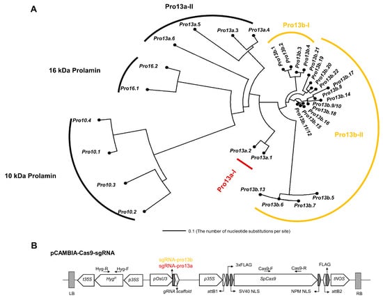 Strategy for simultaneous editing of multiple prolamin genes using CRISPR-Cas9. (A) A phylogenic tree of prolamin genes was constructed using Dendroscope (ver 3.5.7). Genomic sequences were from the Rice Annotation Project Database (https://rapdb.dna.affrc.go.jp/, (accessed on 30 March 2019)). Target genes of two sgRNAs, sgRNA-pro13a and sgRNA-pro13b, are shown in red and yellow, respectively. (B) Structure of the pCAMBIA-Cas9-sgRNA binary vector. The binary vector carries sgRNA-pro13a (AACGTAGCTGGTTGCCAGAAGGG) or sgRNA-pro13b (AAACGCAGCTGATTGCAAGAAGG) under the control of the pOsU3 promoter. Primers for PCR amplification are indicated by black arrows.