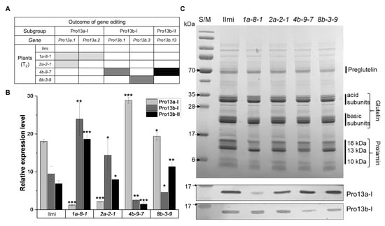 Production of 13 kDa prolamin-knockout T2 lines with reduced prolamin content. (A) Outcomes of gene editing in the T2 generation of 13 kDa prolamin-knockout lines (1a-8-1, 2a-2-1, 4b-9-7, and 8b-3-9). Shaded boxes indicate which genes in each mutant line carry frameshift mutations. Different colors represent mutations in different 13 kDa prolamin subgroups. (B) Comparison of Pro13a-I, Pro13b-I, and Pro13b-II subgroup expression in WT (Ilmi) and 13 kDa prolamin-knockout lines. qRT-PCR was performed 2 weeks after flowering to quantify transcripts of the indicated 13 kDa prolamin genes in immature seeds of WT and mutant plants. Values are mean ± SD (n = 3). p-values were calculated by the Student’s t-test (* p < 0.1, ** p < 0.01, and *** p < 0.001). (C) Analysis of SSP levels in Ilmi and 13 kDa prolamin-knockout lines by SDS-PAGE (top) and Western blot (below). Total SSPs (5 µg) were separated on a gradient SDS-PAGE gel (10–17.5%). The resolved SSPs were transferred onto a polyvinylidene fluoride (PVDF) membrane, and the membrane was incubated with anti-Pro13a-I or anti-Pro13b-I antibodies, as indicated. S/M: Size marker.