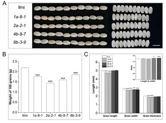Morphology of seeds from 13 kDa prolamin-knockout plants. (A) Representative images of WT and knockout seeds. Left: length; Right: width of de-husked seeds. Scale bar = 5 mm. (B) Weight of 100 grains of Ilmi and 13 kDa prolamin-knockout seeds. Values are mean ± SD (n = 3). (C) Comparison of length, width, thickness, and length-to-width ratio of grain between Ilmi and 13 kDa prolamin-knockout seeds. Values are mean ± SD (n = 30). p-values were calculated by the Student’s t-test (* p < 0.1, ** p < 0.01, and *** p < 0.001).