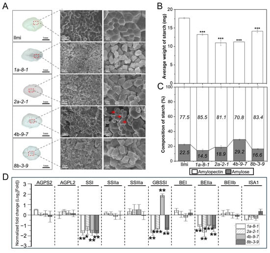 Furthermore, analysis of the amylose and amylopectin content of starch granules revealed a lower ratio of amylose to amylopectin in 1a-8-1, 2a-2-1, and 8b-3-9 plant seeds than in WT, and a higher ratio of amylose to amylopectin in 4b-9-7 plant seeds than in WT (Figure 4C). The starch granules formed angular blocky structures in 1a-8-1, 2a-2-1, and 8b-3-9 plant seeds (low amylose content), while starch granules formed spherical structures in 4b-9-7 plant seeds (high amylose content) (Figure 4A). qRT-PCR was performed in WT and mutant plant seeds to determine the level of expression of ten genes involved in starch metabolism, including ADP-glucose small and large subunit pyrophosphorylases (AGPS2 and AGPL2), starch synthases (SSI, SSIIa, and SSIIIa), granule-bound starch synthase I (GBSSI), branching enzymes (BEI, BEIIa, and BEIIb), and debranching isoamylase (ISA1) (Figure 4D). The results showed that SSI and BEIIa are significantly down-regulated in all four mutant lines. However, GBSSI, implicated in amylose synthesis, was down-regulated in 1a-8-1, 2a-2-1, and 8b-3-9 mutant plants but up-regulated in 4b-9-7 plants. These differences in gene expression probably cause the low average starch mass per grain, altered starch composition, and altered morphology of seeds in the mutant plant lines.