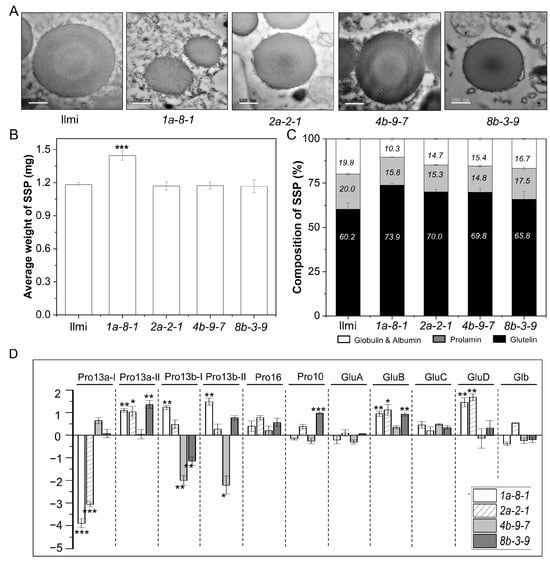 Furthermore, the total content of SSP per grain was higher in 1a-8-1 plant seeds than in WT, while the total SSP content per grain was similar in WT and the other mutant plant lines (Figure 5B). In contrast, prolamins (all sizes) represented 15.8, 15.3, 14.8, and 17.5% of all SSPs in 1a-8-1, 2a-2-1, 4b-9-7, and 8b-3-9 mutant plants, respectively, while prolamins represented 20.0% of WT SSPs (Figure 5C). Conversely, the percent content of glutelins increased significantly from 60.2% in WT to 73.9, 70.0, 69.8, and 65.8% in 1a-8-1, 2a-2-1, 4b-9-7, and 8b-3-9 mutant plant lines, respectively. These results indicate that suppression of expression of certain SSPs was accompanied by compensatory increases in the expression of other SSPs; more specifically, down-regulation of genes in the Pro13a-I subgroup was accompanied by up-regulation of genes in the Pro13a-II, Pro13b-I/II, GluB, and GluD SSP subgroups. Similarly, decreased transcription of Pro13b-I subgroup prolamins was accompanied by increased transcription of Pro13a-II, Pro10, and GluB SSPs. Nevertheless, down-regulation of genes in Pro13b-I/II subgroups was not accompanied by compensatory changes in expression of SSP genes in other groups (Figure 5D).