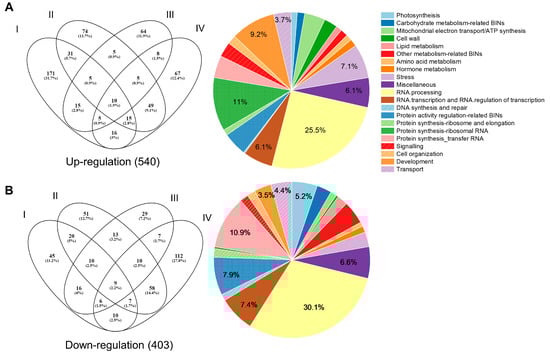Transcriptome analysis identified DEGs in 13 kDa prolamin-knockout lines. (A) Venn diagram and functional classification of 540 genes up-regulated relative to WT control (Ilmi). (B). Venn diagram and functional classification of 403 genes down-regulated relative to WT control (Ilmi). Results for 1a-8-1, 2a-2-1, 4b-9-7, and 8b-3-9 plants are labeled with ellipses designated I, II, III, and IV, respectively.